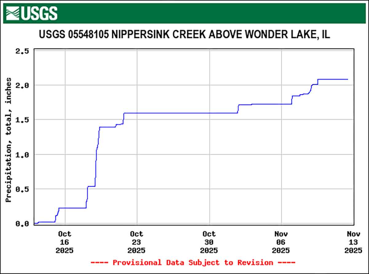 3. The Nippersink Creek USGS stream gage at Thompson Road upstream of Wonder Lake recorded roughly 2.1 inches of rain over the past month. The gage also showed the corresponding “spikes” in streamflow from the rainfall events, as shown in the second chart. Nippersink streamflow into the lake today is at roughly 10.3 cubic feet per second (cfs), which is still below the 30-year average of 30 cfs for this date.