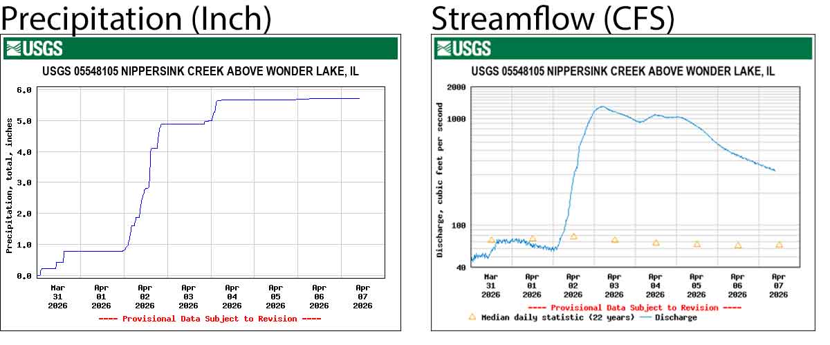 2. From early last Thursday morning through last Friday night, roughly 4.5 inches of rain was recorded at the USGS stream gage at Thompson Road. As a result of similar heavy rainfall totals in the watershed above Wonder Lake, Nippersink Creek rose almost 4 feet, with streamflow increasing from 60 cubic feet pr second (cfs) to a peak of 1,500 cfs. As a result, a Lake Closed email was sent out on Friday, April 3rd. The following information is from the MPOA website.