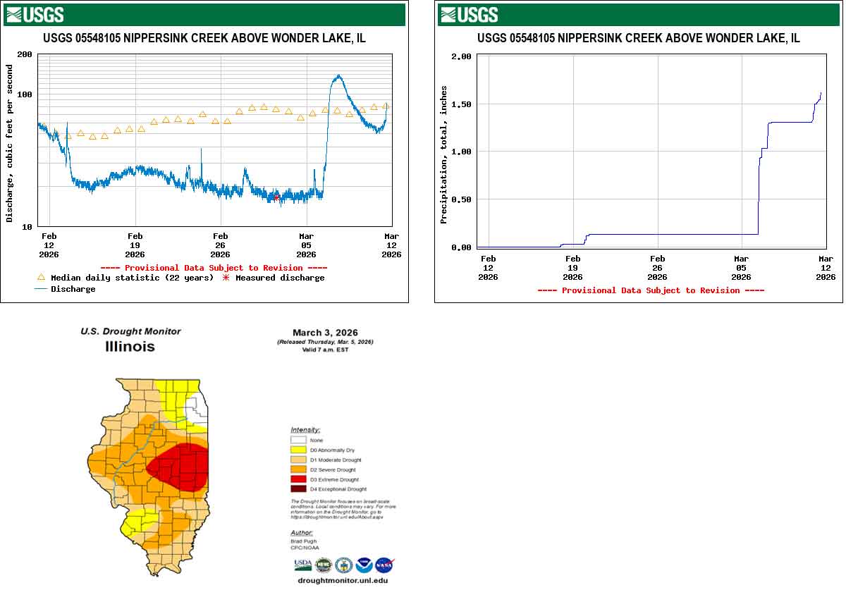4. As shown below, the long-term average Nippersink Creek streamflow for the last 30 days is around 60 cubic feet per second (cfs). For much of the last month, that average has been closer to only 20 cfs; roughly 66% lower than average flows this time of year. The rainfall last weekend and last night has gotten streamflow back towards more average flows.