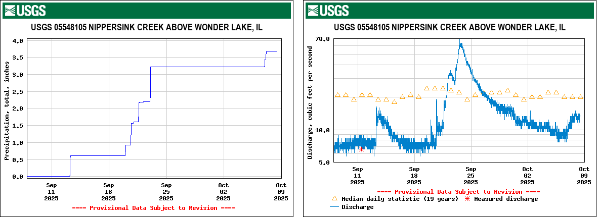 2. The Nippersink Creek USGS stream gage at Thompson Road upstream of Wonder Lake recorded roughly 3.7 inches of rain over the past month. The gage also showed the corresponding “spikes” in streamflow from the rainfall events, as shown below in the second chart. Nippersink streamflow into the lake today is at roughly 15 cubic feet per second (cfs), which is still below the 30-year average of 20 cfs for this date.