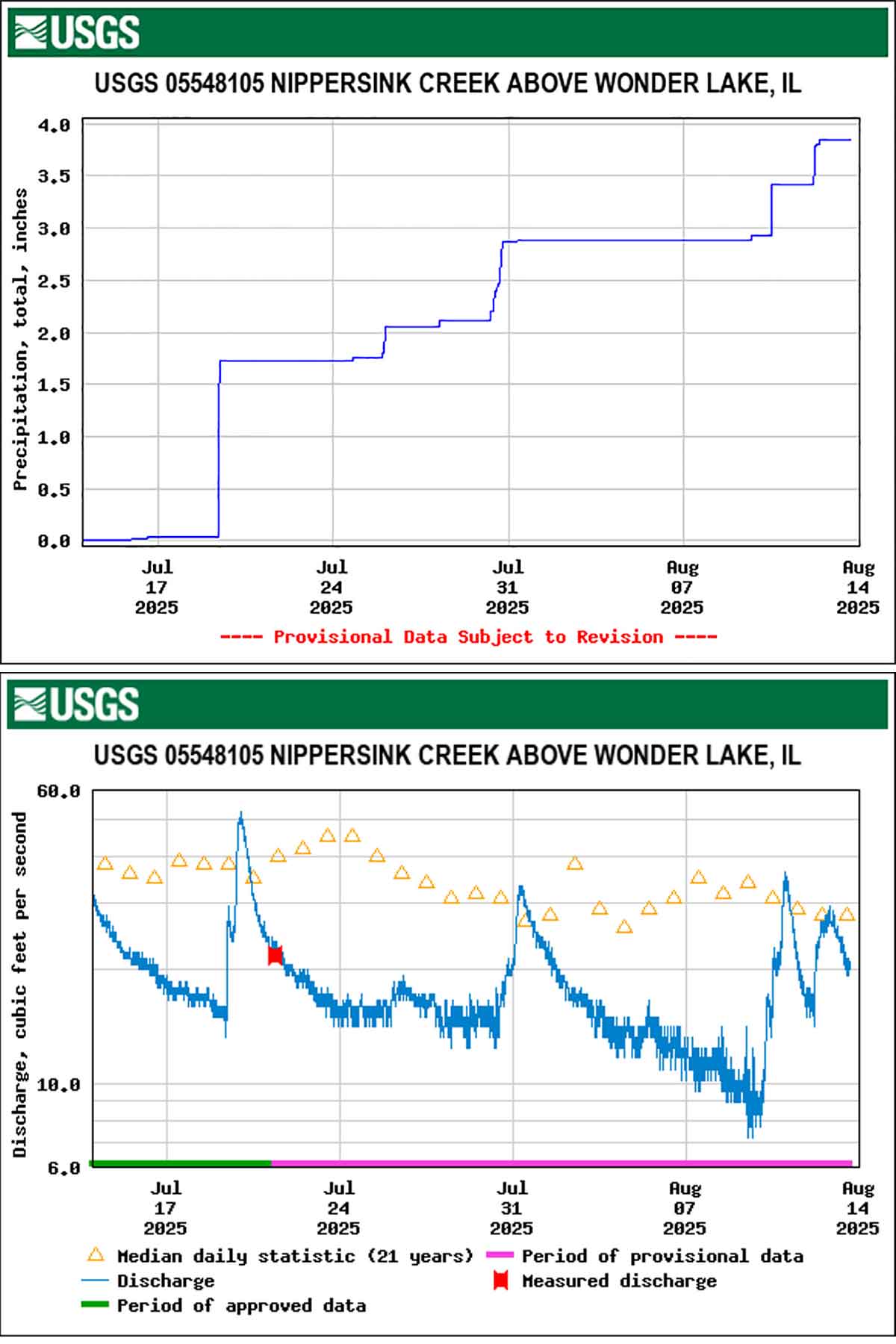 2. The Nippersink Creek USGS stream gage at Thompson Road upstream of Wonder Lake recorded just under four inches of rain in the last month. The gage also showed the corresponding “spikes” in streamflow from the rainfall events, as shown below in the second chart. Nippersink streamflow into the lake today is at roughly 20 cubic feet per second (cfs), which is still below the 30-year average of 30 cfs for this date.